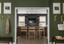 The other spaces in the 1,900-square-foot level get a lot of use, too, but the expansive entertaining room steals the show. In fact, it’s got a James Bond–type feature or two: Guests enter via a secret door disguised as a bookcase. Another door hidden in the paneling conceals equipment. “The hidden doors give the basement a fun and secretive feel, and I also felt like it gave my clients a lot of bang for their buck, design-wise,” says Chelsea. “Plus, their kids love showing people the hidden doors, and Dad got his dream of having this ‘secret’ space.”
